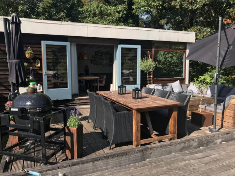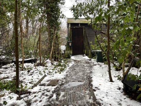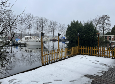Gestoffeerde woonark in jachthaven a/d Nieuwe Meer met ca 25m2 terras.